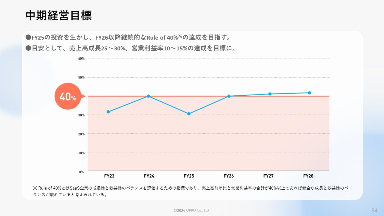 我々の中期経営目標についてです。やはり「Rule of 40%」にはこだわりを持って取り組んでいきたいと考えています。具体的には、売上高成長率を25パーセントから30パーセント、営業利益率を10パーセントから15パーセントを目標とし、これらをしっかり達成することで「Rule of 40%」を継続する企業を目指していきたいと考えています。