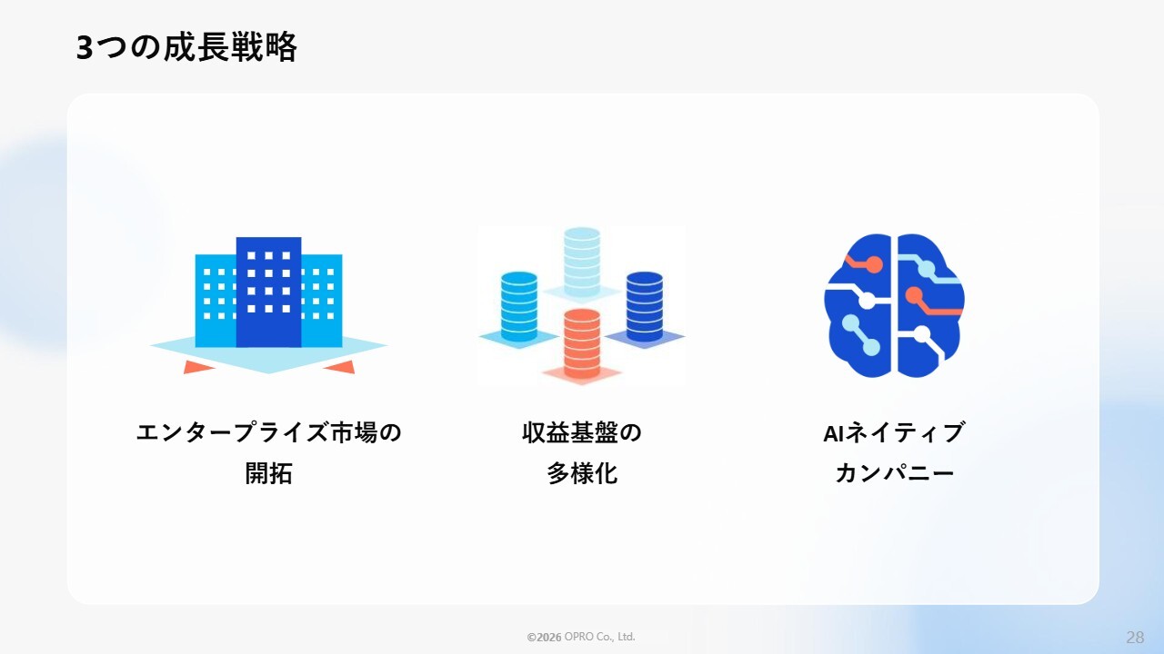 これら製品を活用した成長戦略および中期経営目標についてご説明します。まず、3つの成長戦略を掲げています。1つ目はエンタープライズ市場の開拓、2つ目は収益基盤の多様化、3つ目は私たち自身がAIネイティブカンパニーになることです。