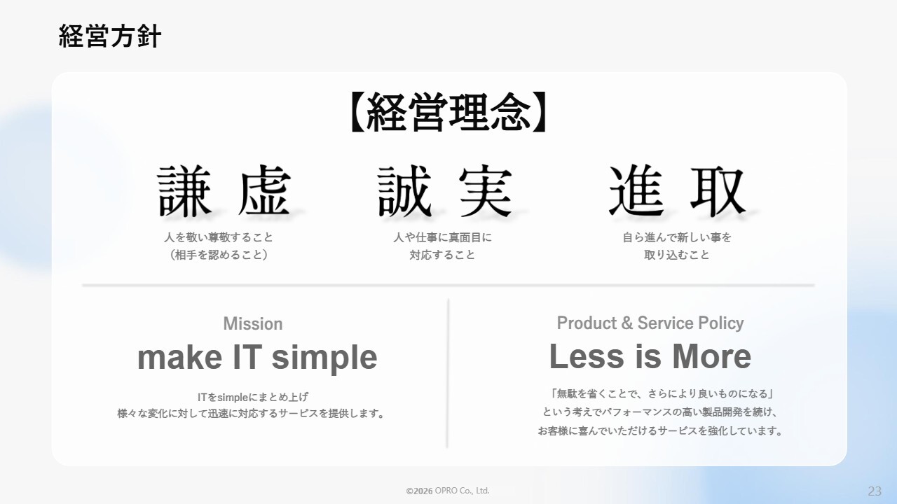 当社はソフトウェアサービスを提供する企業であるため、製品やサービスに対して「Less is More」という明確なポリシーを掲げています。これは「無駄を省くことで、さらにより良いものになる」という意味です。このポリシーに基づき、製品の開発やサービスの提供を行っていきます。