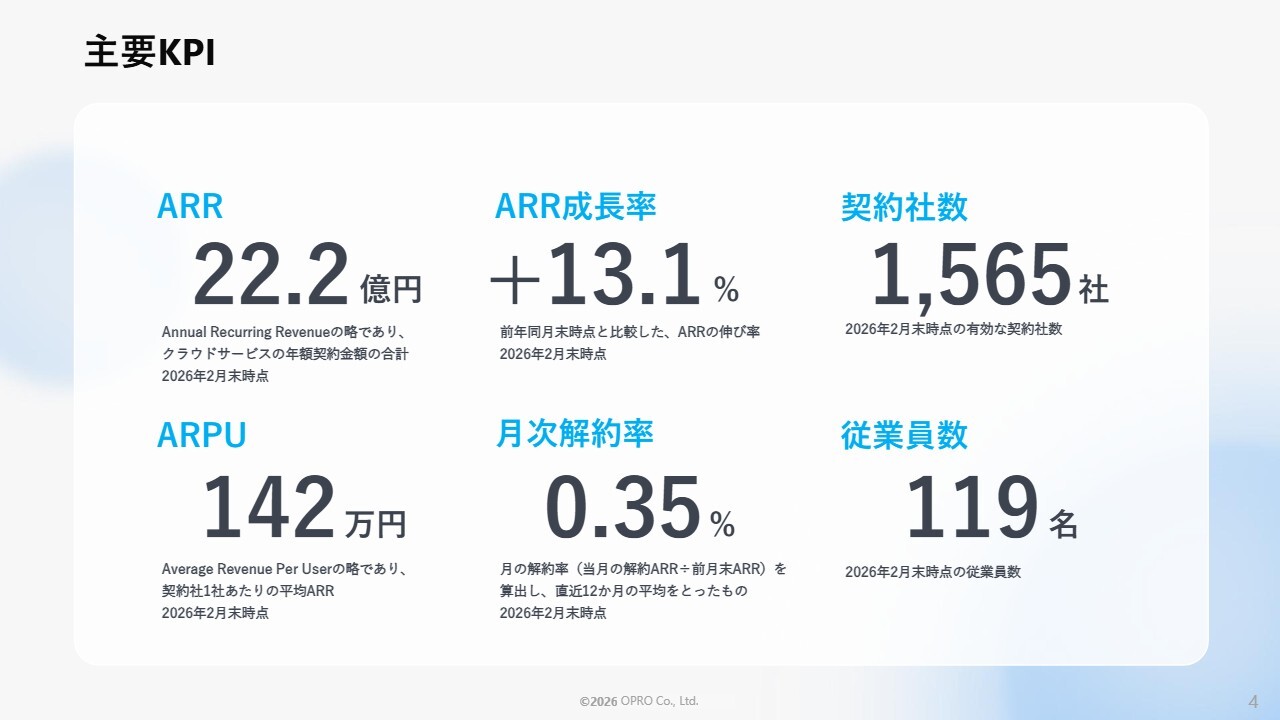 2026年11月期第1四半期の実績についてご報告します。主要KPIとして、ARR(年間経常収益)は22億2,000万円となり、前年同期比で13.1パーセント増加しました。契約社数は1,565社で、ARPU(1社あたりの平均ARR)は142万円です。月次解約率は0.35パーセントです。従業員数は119名となっています。これらのKPIはすべて2026年2月末時点の数字です。