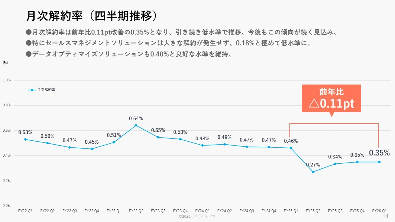 月次解約率は0.35パーセントと極めて低水準で、安定的に推移していると自負しています。特にセールスマネジメントソリューションは0.18パーセントと極めて低水準を記録しました。これは当社の販売管理ソリューションを十分にお客さまに活用していただいている結果だと考えています。