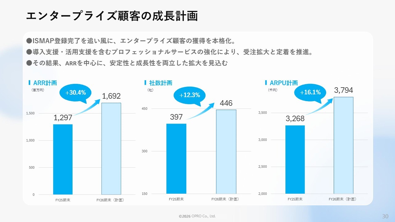 エンタープライズ顧客の成長計画について、スライドに数値目標を記載しています。ARR計画においては現在の約13億円から、2026年11月末には約17億円に引き上げることを目指しています。社数計画については、2026年11月末の目標を397社から446社に定めています。