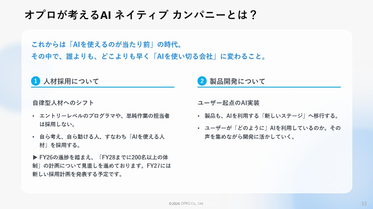 当社は、AIネイティブカンパニーを目指し、積極的に投資を行っています。この点が非常に重要であると考え、まずツールとしてAIをしっかりと採用しています。現在では全社レベルでAIを活用しており、AIを使用する人材については、ある意味で選抜されています。