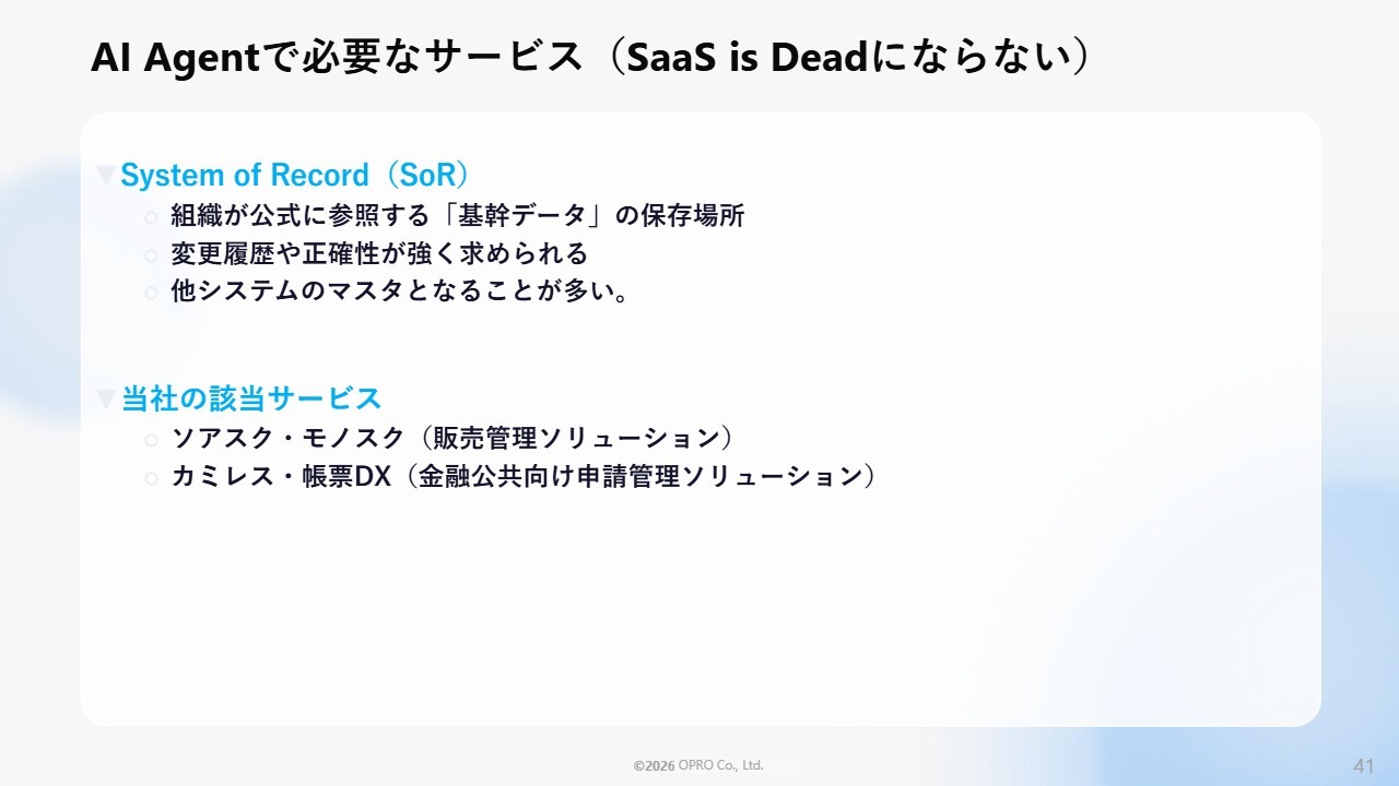 ただし、先ほどお話ししたように、ナデラ氏が言いたかったのは「AIが使うデータベースに、これからSaaSは変わっていく」ということです。これはどのようなことかというと、AIエージェントに必要なサービスであれば「SaaS is Dead」にはならないということです。