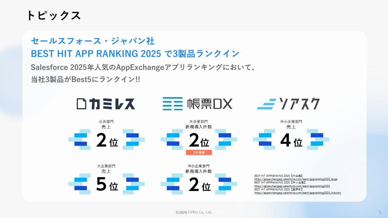 トピックスをいくつかご紹介します。当社の最重要パートナーであるセールスフォース・ジャパン社より「BEST HIT APP RANKING 2025」が発表され、当社の3製品がランクインしました。