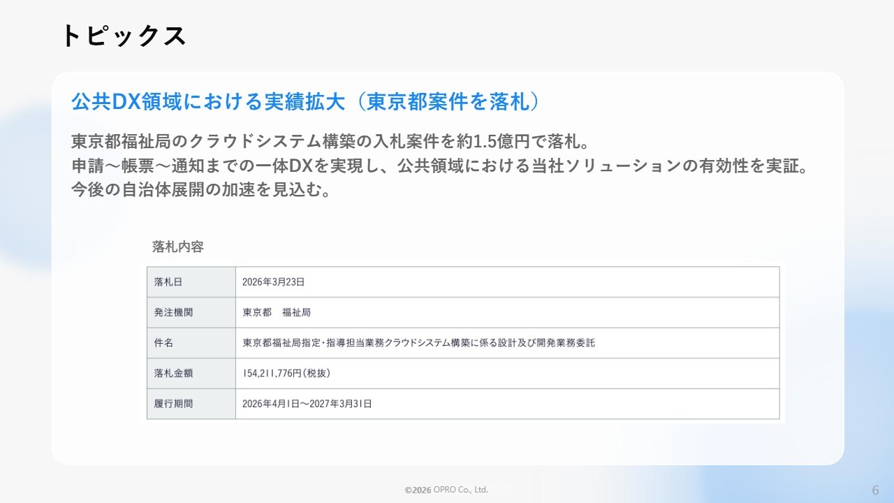 次に、当社が現在注力しているエンタープライズ領域の公共部門において、3月23日に東京都福祉局の案件を約1億5,000万円で無事に直接落札することができました。当社は2億円弱までの規模の案件について直接入札することを目標としており、そのためにコンサルティング部門の体制も整えています。今回はその体制がしっかりと活かせたと考えています。