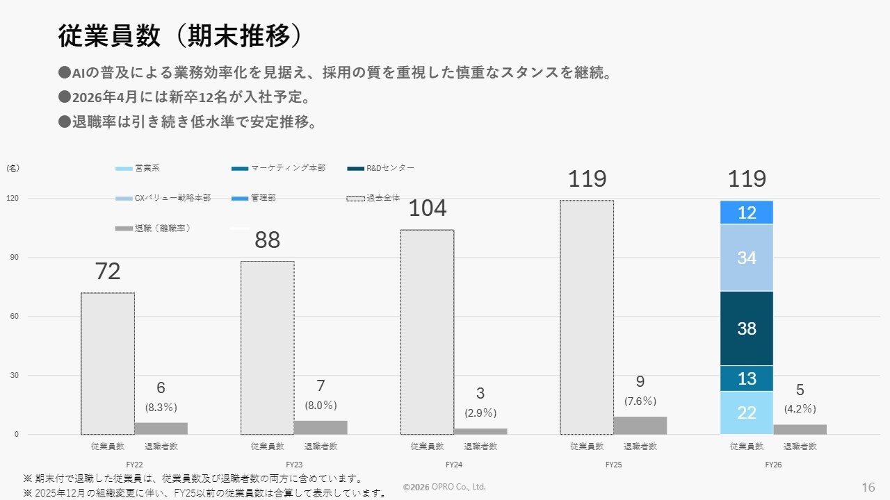 従業員数です。前期と同じく119名となっています。2026年4月に新卒12名が入社したため、第2四半期以降は若干の増加となる見込みです。
