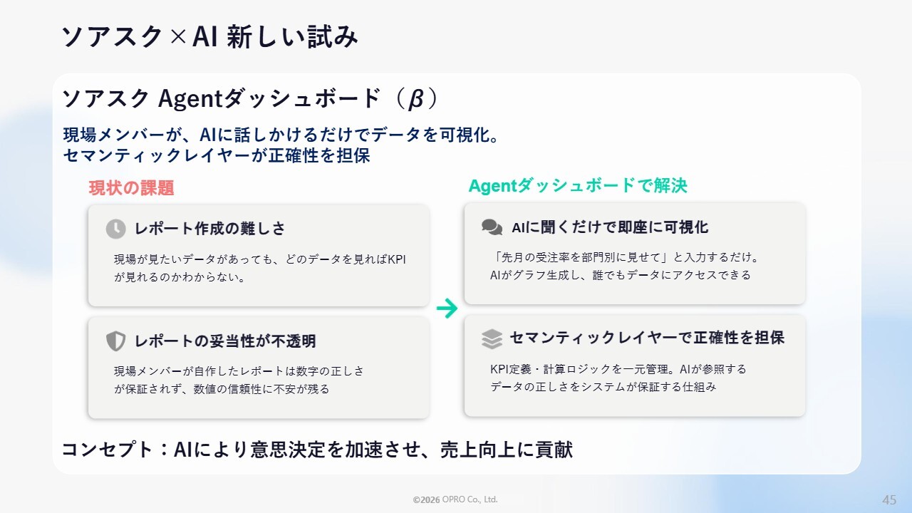 これらはまだ製品化できておらず、現在はベータ版として取り組んでいます。特に5月からは、既存ユーザーに対して「ソアスク Agentダッシュボード」をベータ版としてご利用いただきます。マネタイズについては、FY2027以降を予定しています。