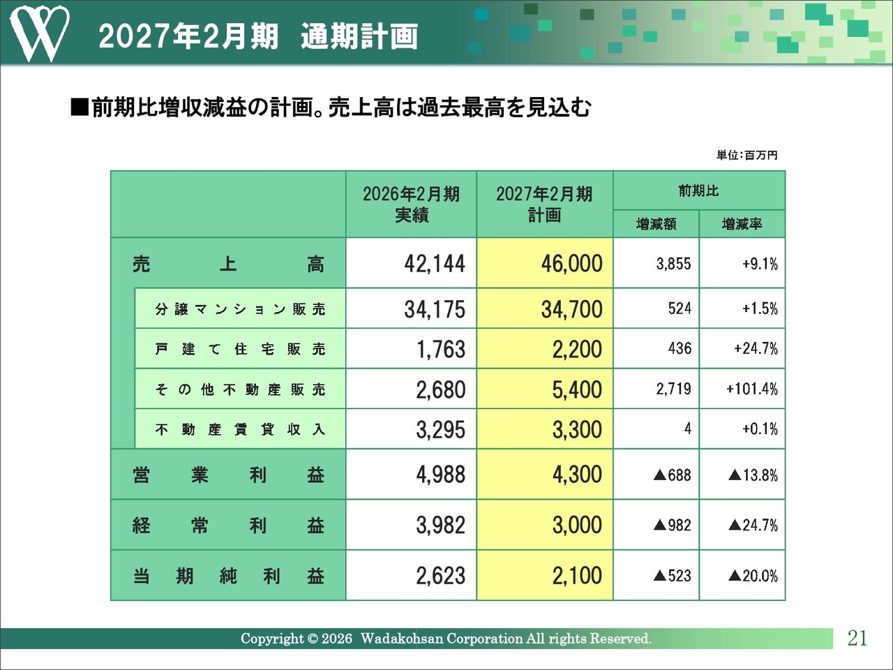 今期の計画では、木造および鉄骨の販売用収益物件で、おおむね前期並みとなる13プロジェクト197戸の販売を予定しています。これらに加えて、一棟卸の賃貸マンションと住宅型有料老人ホームの売却により、約20億円の売上を見込んでいます。