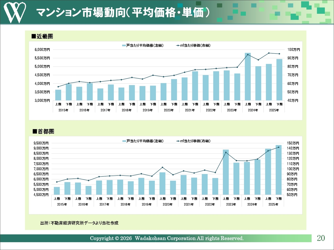 近畿圏全体の戸当たり平均価格は0.5パーセント下落しましたが、投資用物件を除くと前年比で約5パーセント上昇しています。また、首都圏では戸当たり平均価格と平米当たり単価の両方で最高値を更新しました。