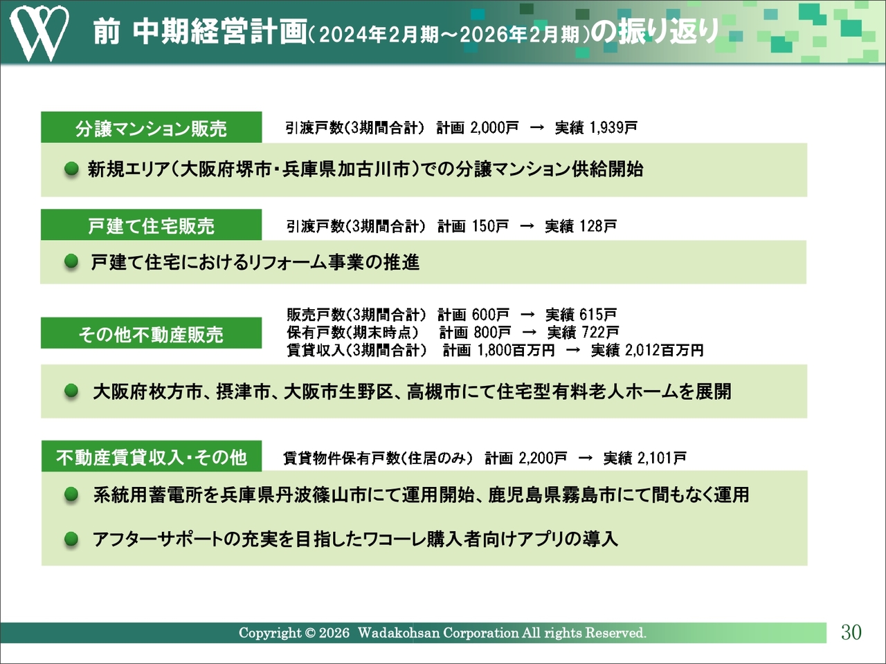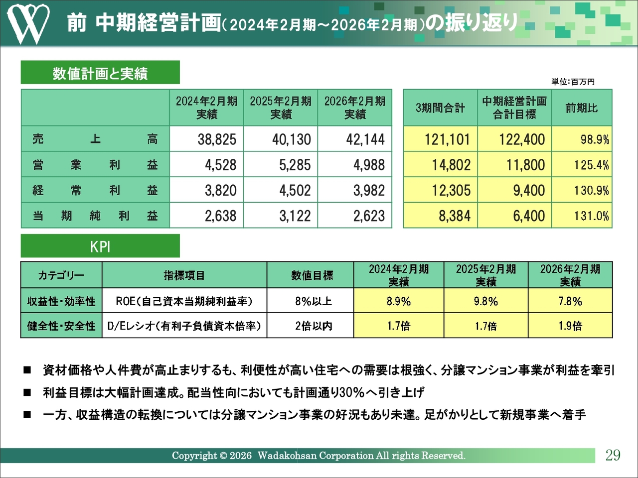 ここからは、2024年2月期から2026年2月期までの3ヶ年の中期経営計画の振り返りについてご説明します。