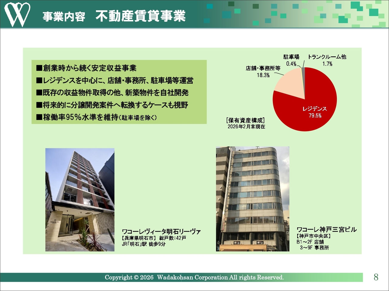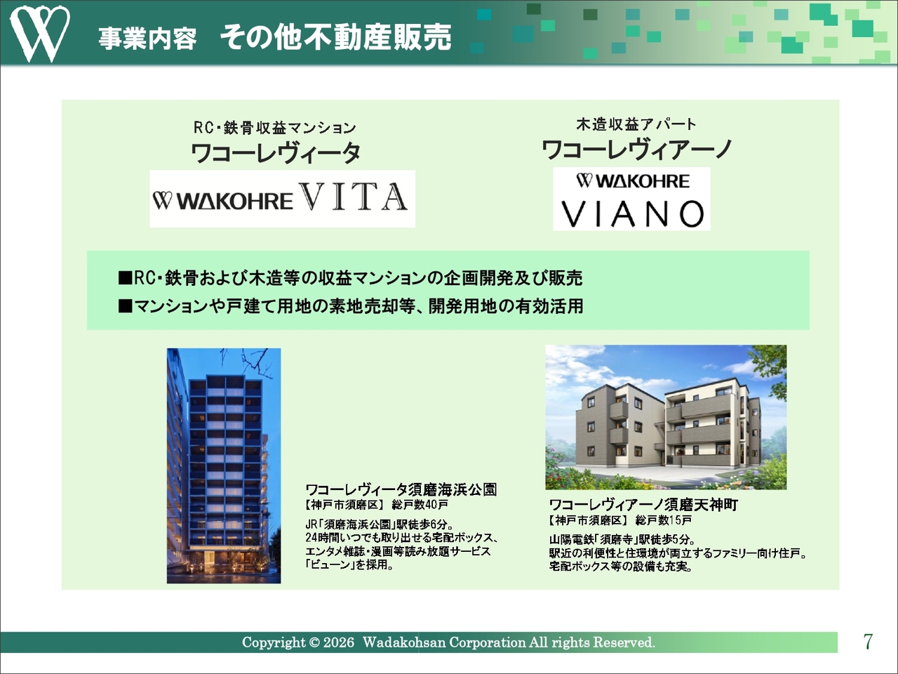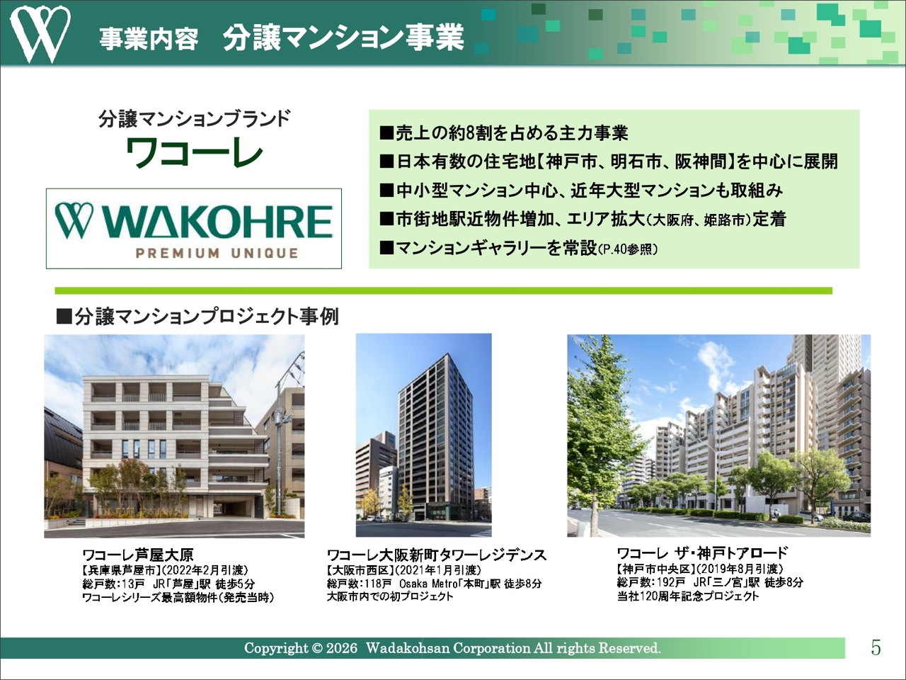主力の分譲マンション販売事業では、「ワコーレ」のブランドで、神戸市や阪神間の地元地域を中心に、大阪府から兵庫県姫路市までエリアを拡大しています。マンションの規模は中小型物件が多く、年間に20棟前後を供給しています。神戸市では供給棟数が28年連続で第1位となっており、昨年は近畿圏においても供給棟数で第3位となりました。