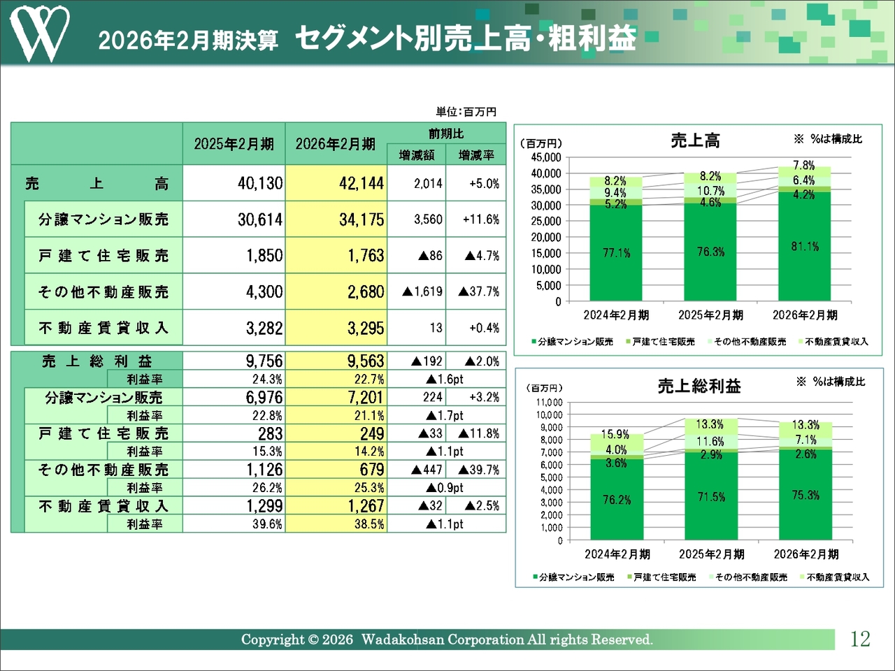 2026年2月期決算の概要についてご説明します。分譲マンションおよび販売用収益物件が好調に推移し、売上高・利益ともに期初計画を上回りました。