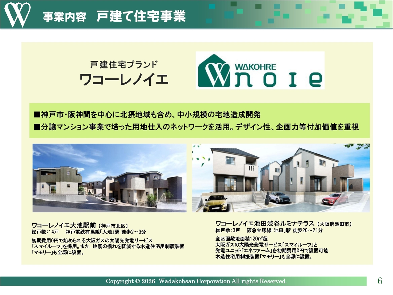 これまで培ってきた用地情報のネットワークを有効活用する観点に加え、開発物件の出口の多様化を図るため、「ワコーレノイエ」というブランド名で展開している戸建て住宅事業については、こちらのスライドに記載しています。