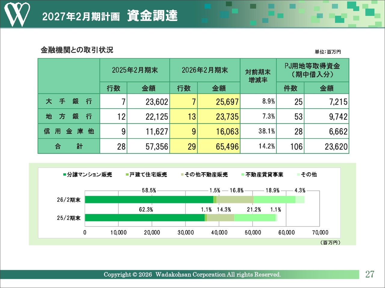 金融機関からの借入金については、分譲マンションの用地取得に係る資金調達だけでなく、販売用収益物件の増加に加え、新たに住宅型有料老人ホームや系統用蓄電所への取り組みなども含まれ、借入金が増加傾向にあります。前期末残高は2025年2月末と比べ、約81億円増加し、654億9,600万円となりました。