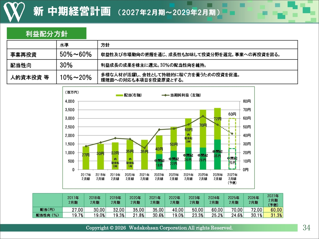 株主のみなさまへの還元策については、安定配当の継続を基本方針としています。2026年2月期の増益決算および利益配分の目安となる配当性向30パーセントを踏まえ、期末配当を期初計画の35円から2円増配の37円とし、年間では72円とする方針です。この内容については、5月28日開催の株主総会に付議する予定です。