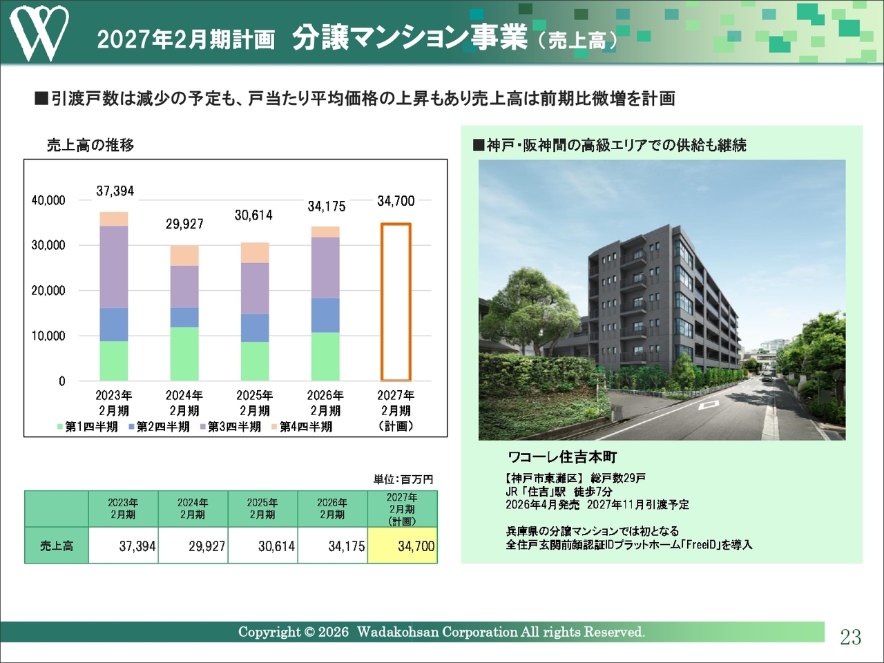 前期の実績については、引渡戸数が610戸となり、期初計画を10戸上回りました。今期は、585戸の引渡しを予定しており、前期より減少しますが、戸当たり平均価格は約5,900万円と上昇基調が続いています。