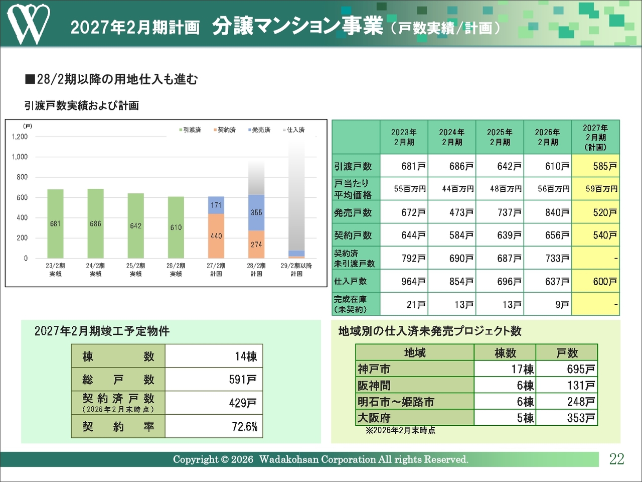 なお、今期の竣工予定物件14棟591戸のうち、本年2月末時点で429戸を契約しており、進捗率は72.6パーセントとなっています。また、契約済み未引渡戸数は2028年2月期以降の引渡物件も含めて733戸に達しており、金額ベースでは447億円となります。