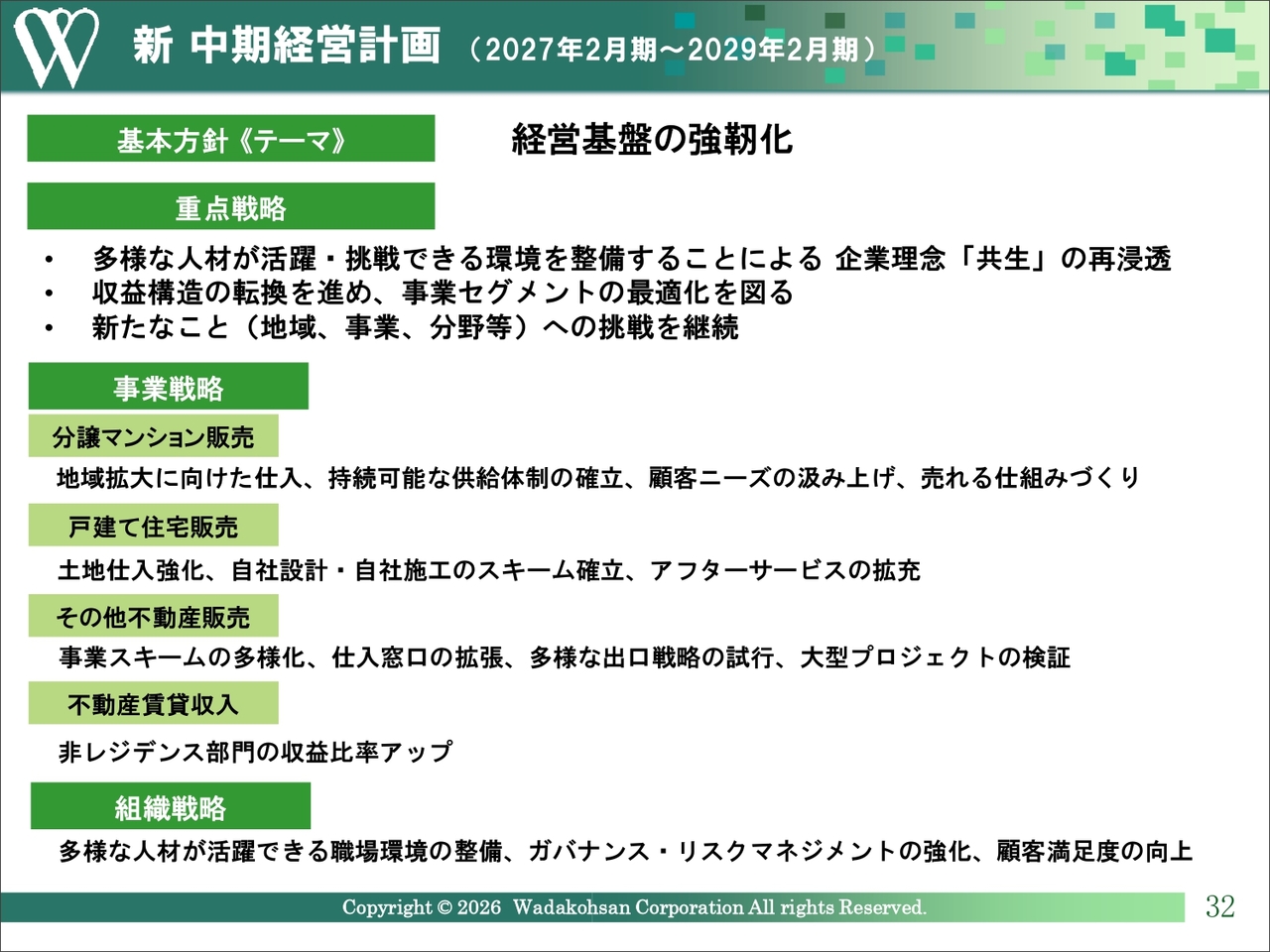 和田興産(8931)26/2期:26年2月期は分譲マンション販売は戸当たり販売価格の上昇で増収を達成したが、素地売り等の反動により減益。27年2月期は過去最高水準の売上高を計画し、新中計では収益構造の転換や人的資本への投資強化など重点戦略を推進。【書き起こし】