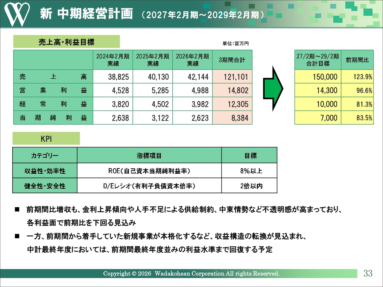 また、KPIは、収益性・効率性の観点からROEを8パーセント以上、健全性・安全性の面からD/Eレシオを2倍以内とすることを目標にしていましたが、2026年2月末の実績ではROEは7.8パーセントとなっています。また、D/Eレシオは目標内の2倍以内に収まっています。