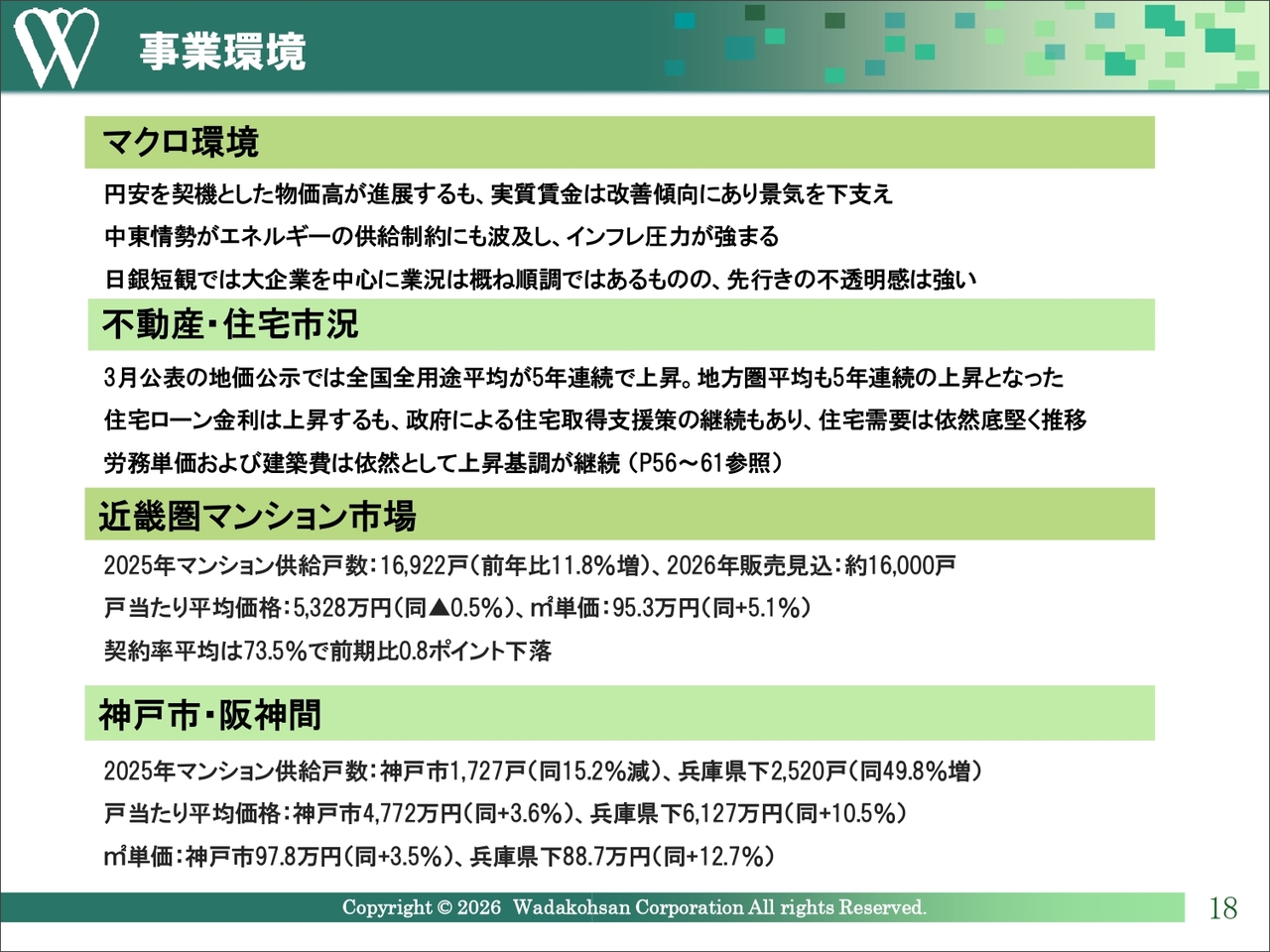 当社の営業地盤である近畿圏、神戸市および阪神間のマンション市場動向については、神戸市では発売戸数が減少している一方、兵庫県全体では大幅に増加しています。価格は戸当たり平均および平米単価ベースで上昇傾向にあります。詳細は資料の51ページから52ページにまとめていますので、後ほどご覧ください。