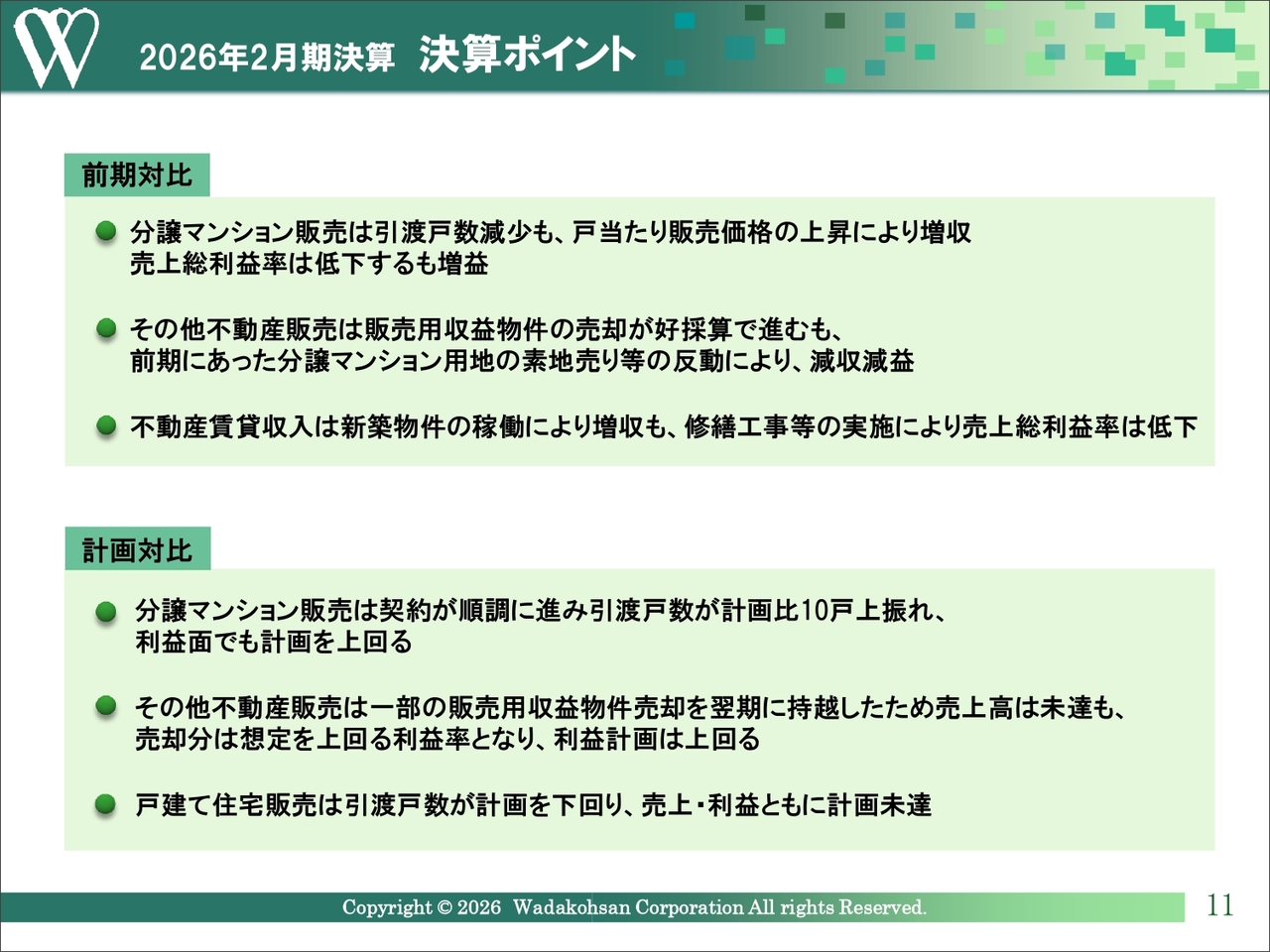 一方で、戸建て住宅販売については引渡戸数が計画を下回り、売上・利益ともに計画未達となりました。