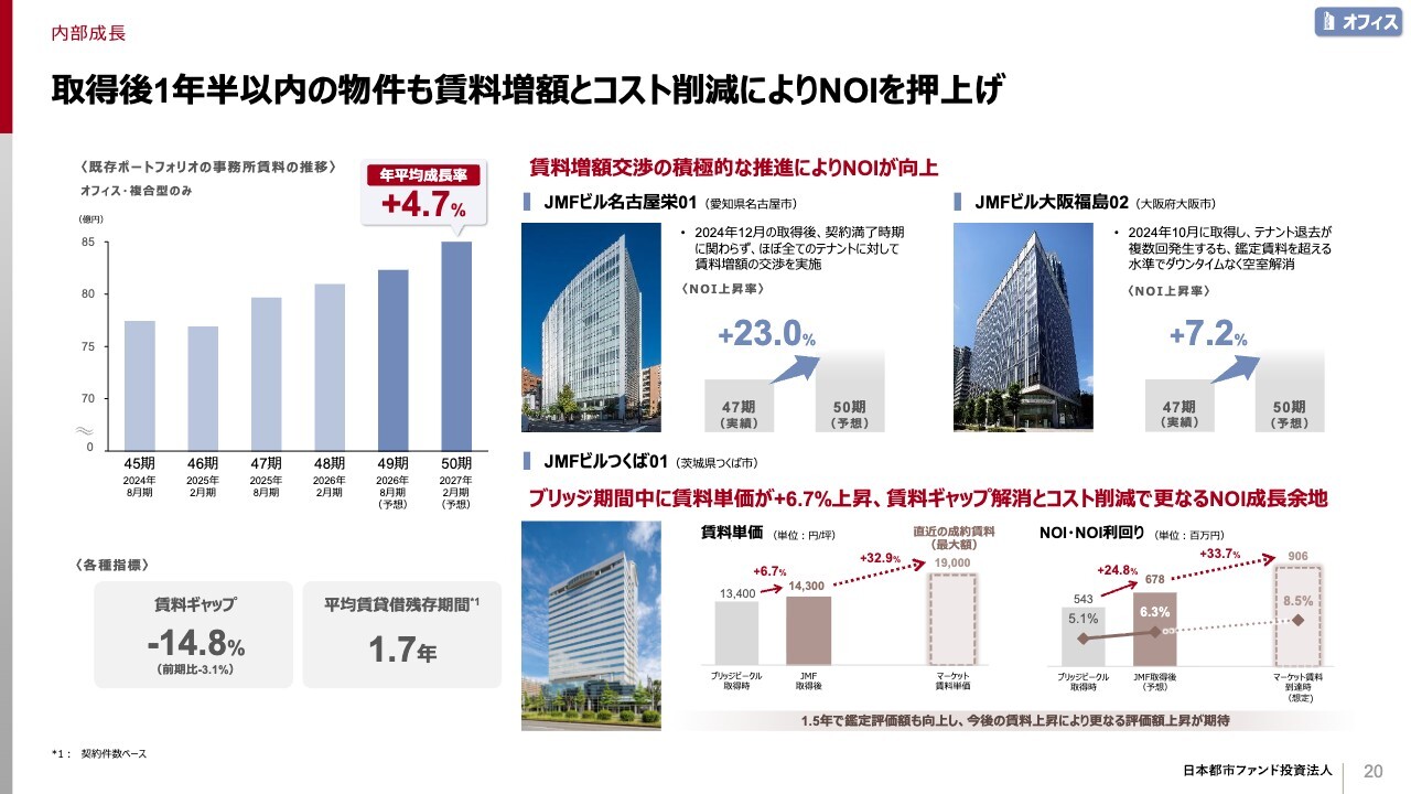 先日取得した「JMFビルつくば01」では、ブリッジ期間中に平均賃料単価を6.7パーセント上昇させ、NOIを24.8パーセント向上させました。直近の成約賃料は、平均賃料単価よりも30パーセント以上高い水準となっています。