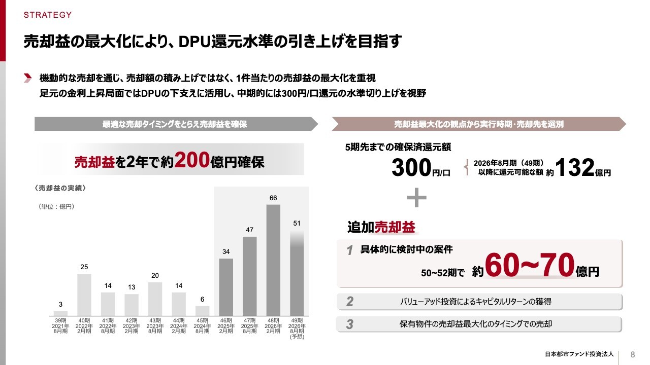売却益還元については、内部成長力の高いポートフォリオであるがゆえに、将来のアップサイドを織り込んだ高水準での取得オファーを継続的に受けており、安定的な譲渡益の創出と還元が可能な状況にあります。
