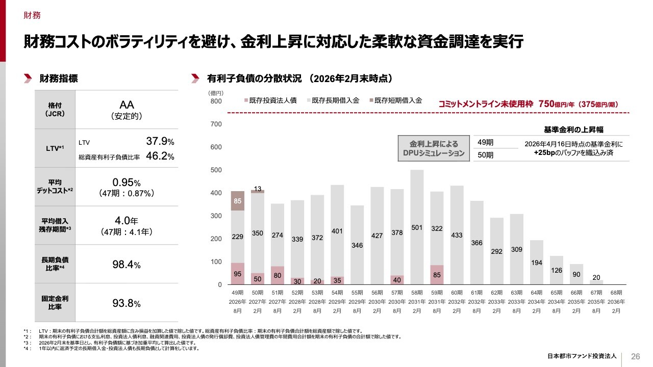 加えて、現在具体的な交渉を進めている「Gビル表参道02」や「アリオ鳳」を含む、2027年から2028年に契約期限を迎える大型4物件のアップサイドが実現すれば、金利上昇によるデットコストの上昇を加味しても、これらだけで実力EPUは2,700円を明確に上回る見通しです。