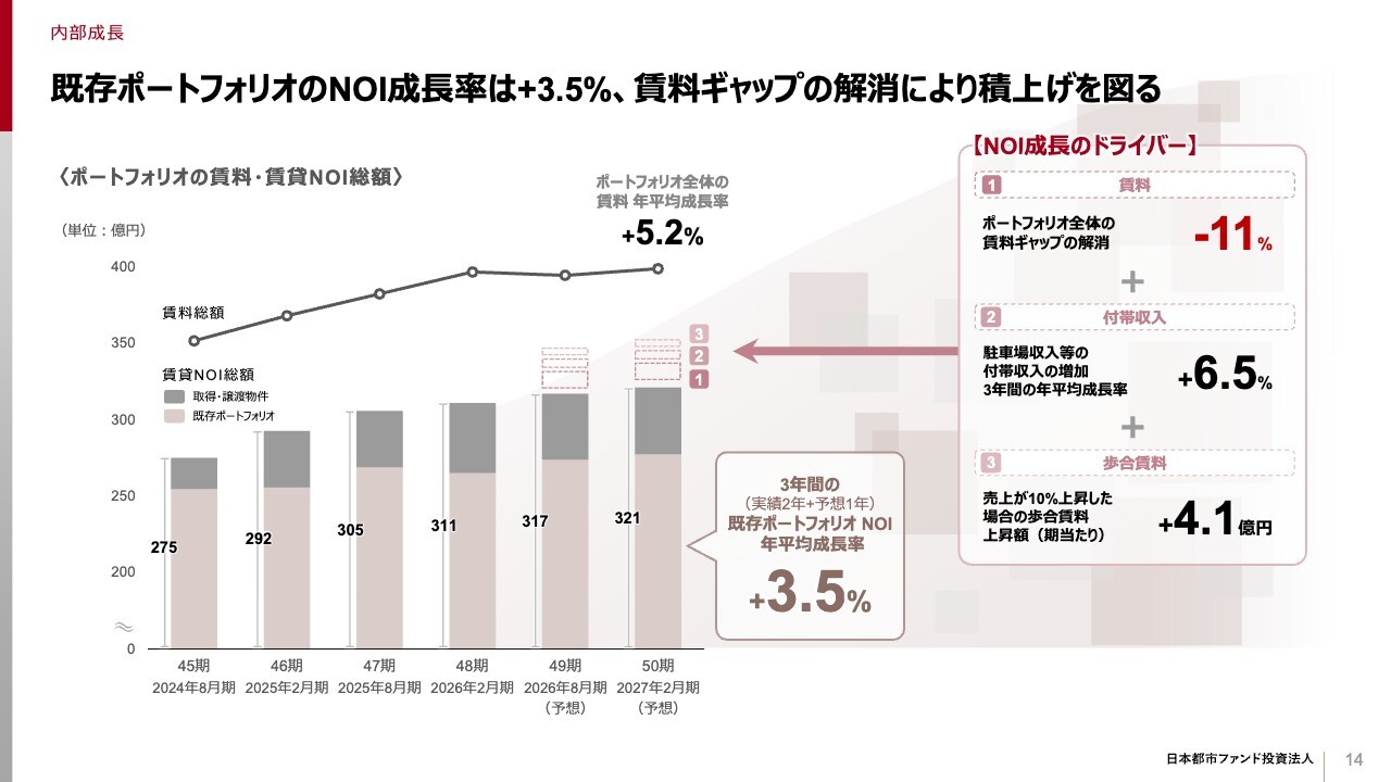 NOIについて、46期は292億円、50期予想では321億円と、2年間で9.7パーセント、年率換算で4.7パーセントの成長を達成し、大きく向上させています。51期以降における大きなアップサイドも確定しており、15パーセントの向上達成に向けて順調に進捗しています。