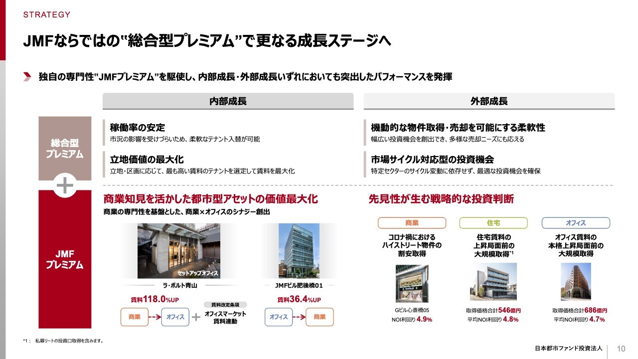 引き続き、特化型REITには真似できない内部成長と外部成長を実現し、総合型プレミアムが付加されるよう、しっかりと運用していきます。