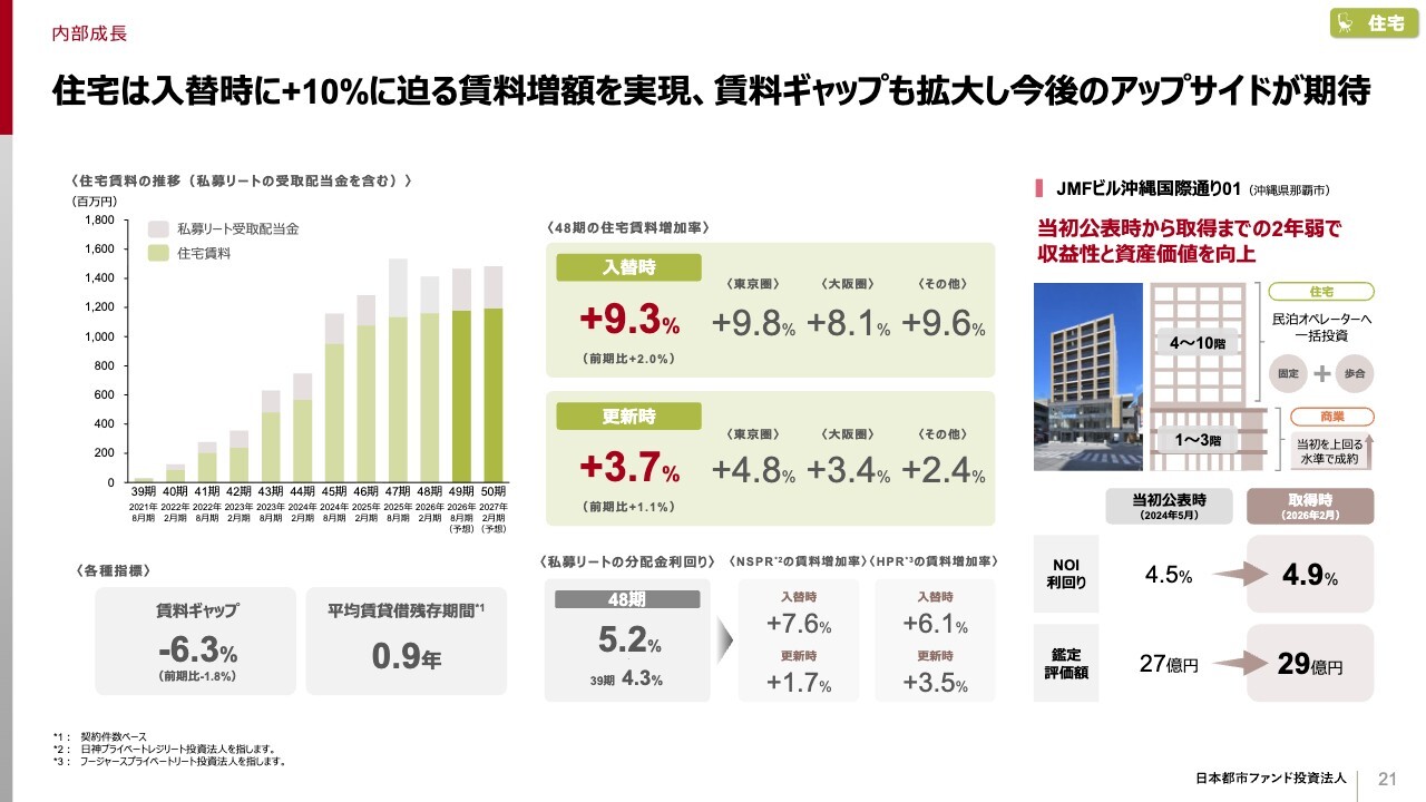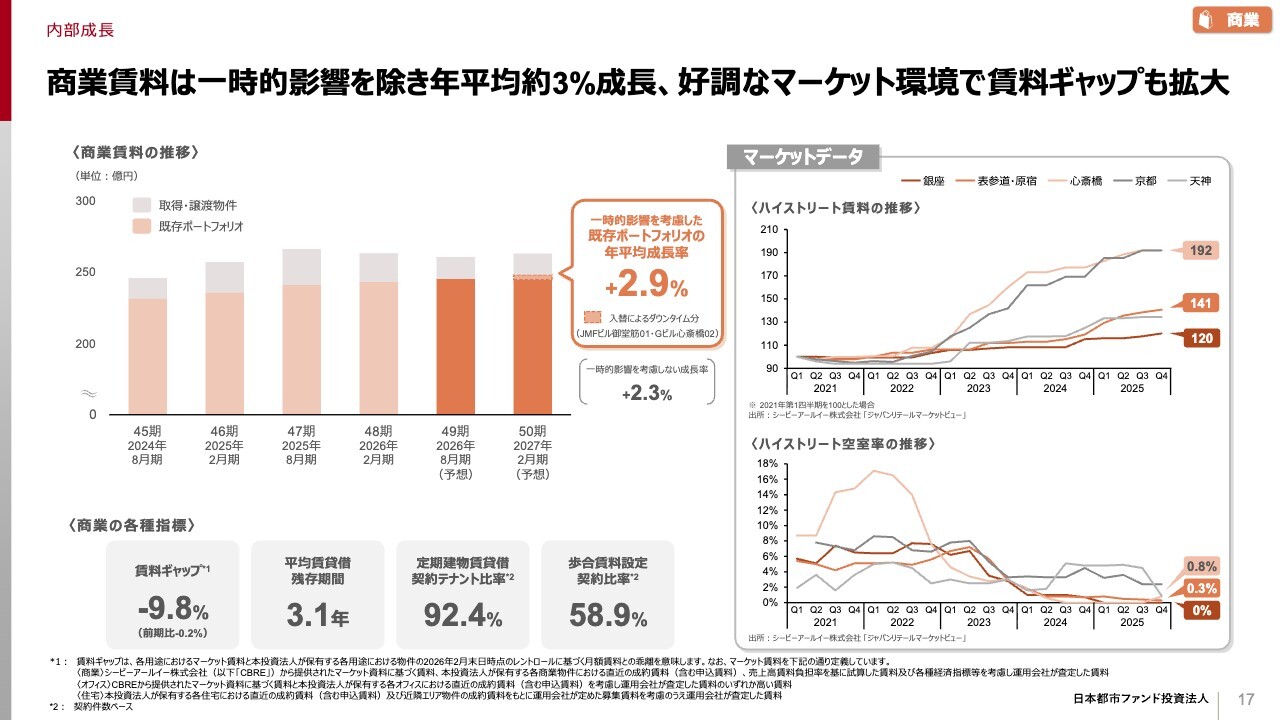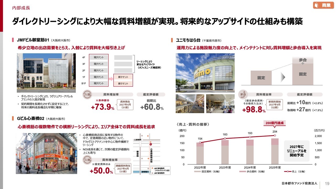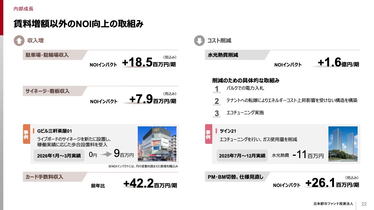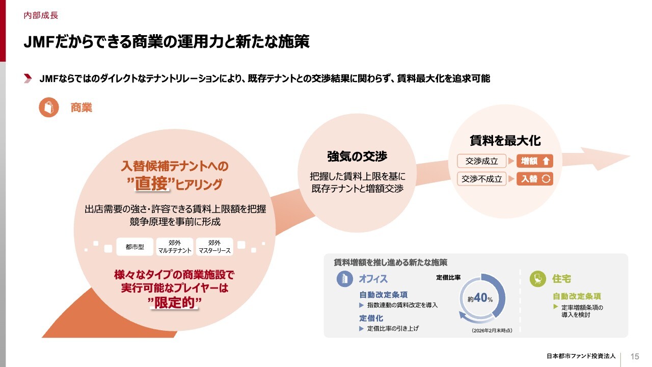 内部成長についてです。商業施設において、これまでご説明した内容に加え、普通借の大型マスターリース物件の賃料増額、数年後に定期借家契約の契約期限を迎える区画に対して、倍近い水準の賃料を提示した先行的な入居オファー、マルチテナント型商業施設におけるテナント入れ替えによる賃料上昇など、多様なアップサイドの実現に向けて水面下で積極的に交渉を行っています。