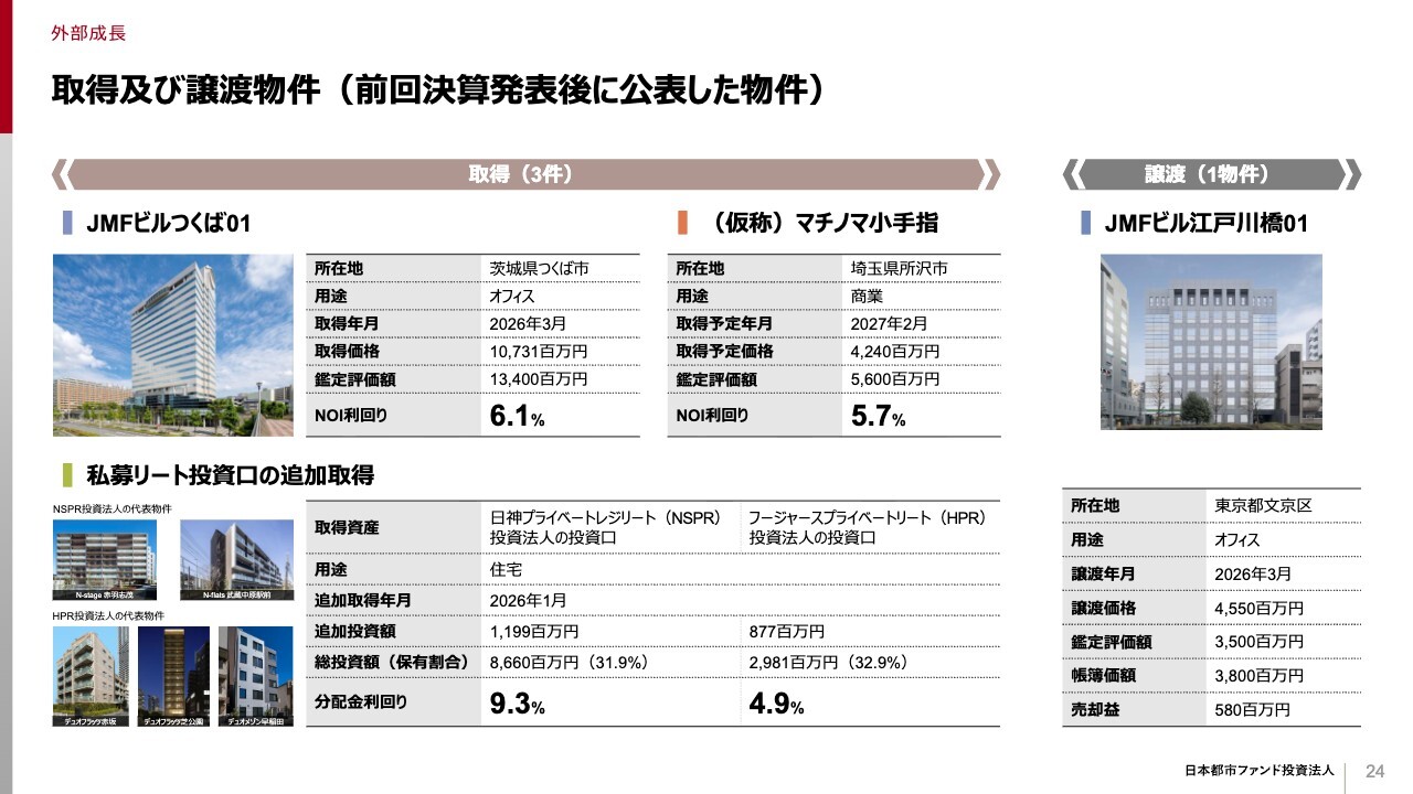 スライドは、前回の決算発表以降に公表した取得および譲渡物件の一覧です。オフィス1物件、商業1物件、私募リート投資口の取得、ならびにオフィス1物件の譲渡となります。