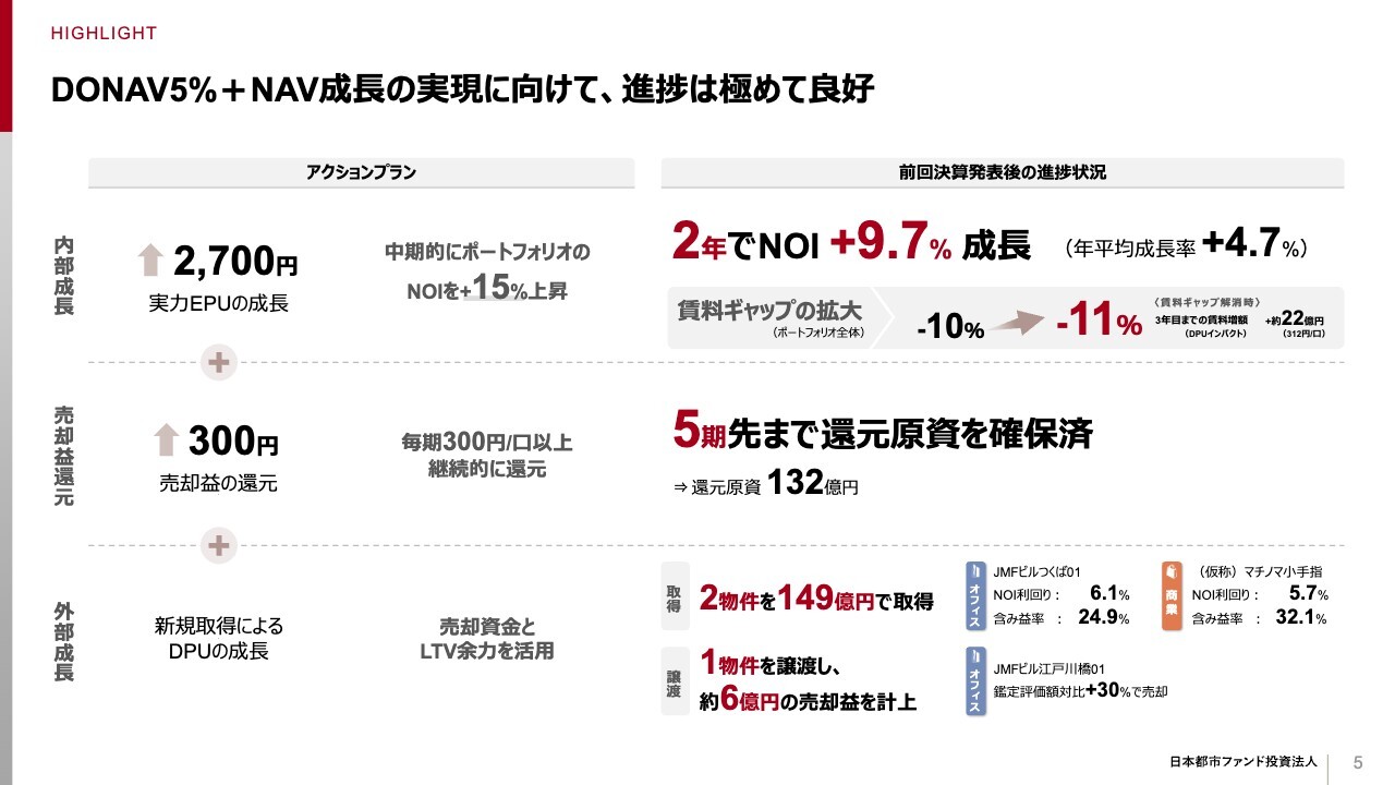 以上のように、内部成長、売却益還元、外部成長の各分野で目標達成に向けて大きな進捗を遂げています。