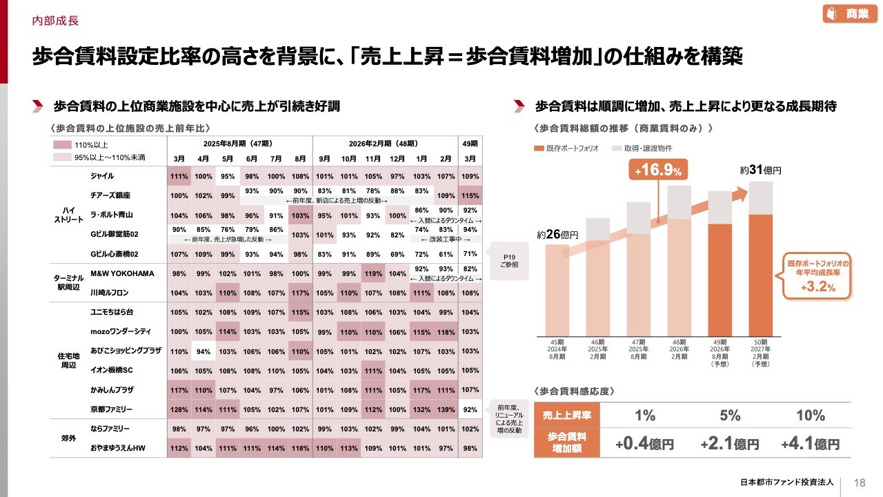 この売上上昇を背景に、歩合賃料は第50期に約31億円に到達し、既存ポートフォリオは年平均3.2パーセントのペースで成長しています。今後の売上増加により、さらなる成長が期待されます。