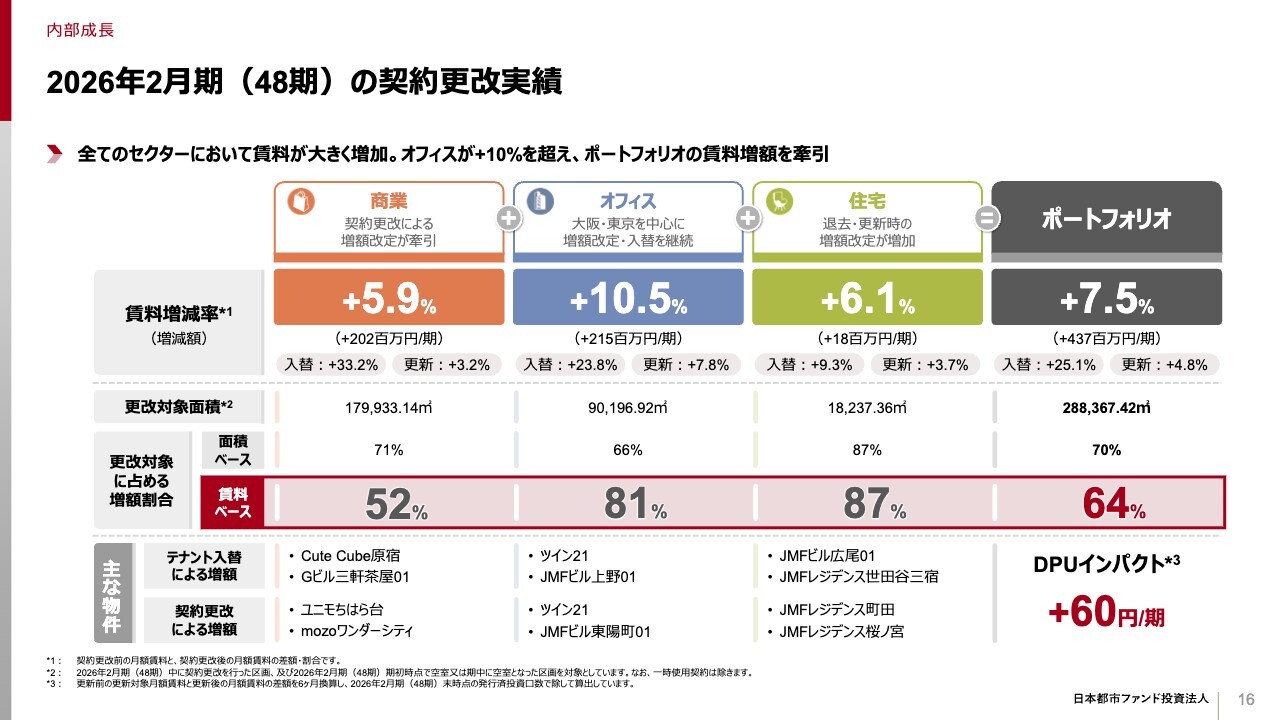 具体的な内部成長の成果についてご説明します。今期の契約更改においては、すべてのセクターで力強い賃料増額が進み、ポートフォリオ全体で賃料増減率は7.5パーセント、DPUインパクトは期当たり60円を達成しました。