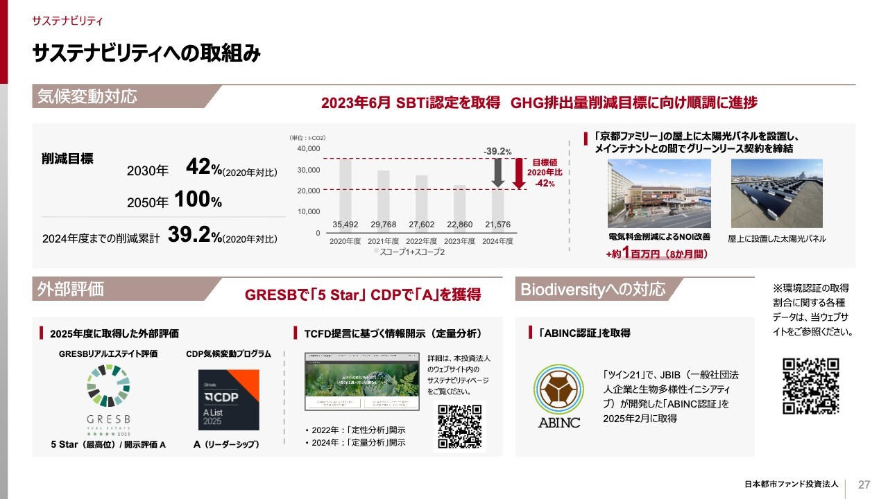 サステナビリティについてです。「京都ファミリー」の屋上に太陽光パネルを設置し、メインテナントとの間でグリーンリース契約を締結することで、電気料金の削減とNOIの向上を実現しました。今後も、このようなNOI向上に貢献するサステナビリティ施策を推進していきます。