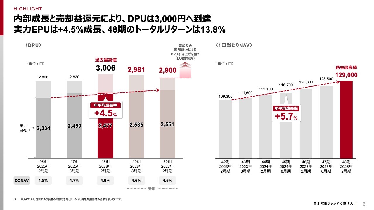 内部成長と売却益還元により、DPUは3,000円へ到達 実力EPUは+4.5%成長、48期のトータルリターンは13.8%