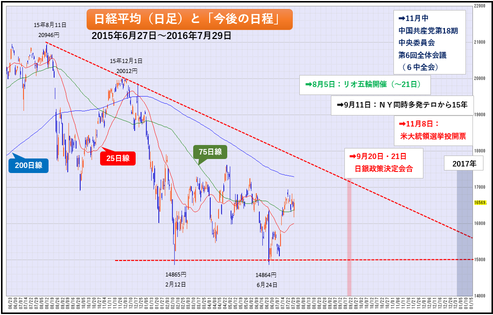 日経平均株価で肝心なのは、448円高の27日(水)や値幅505円の29日(金)ですら、英EU離脱ショック6月24日Wボトムからの2,075円幅の戻り高値、7月21日高値16,938円を抜けなかったことである。(山崎和邦)