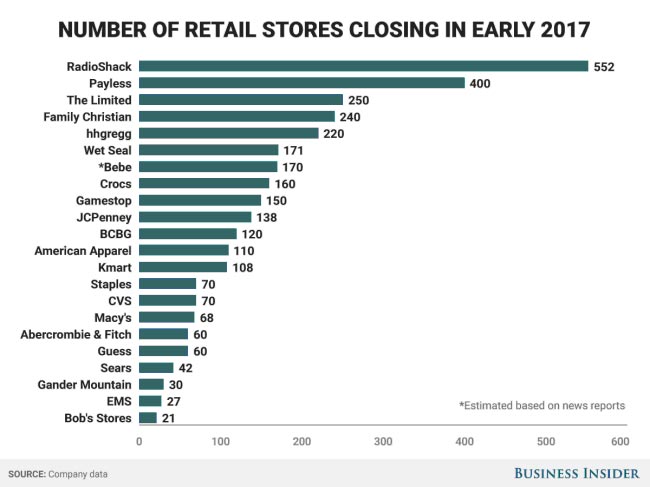 米国でも、2017年に入って3200を超える小売店舗が閉じられた。例えば、アマゾンは創業からの数年間、巨額の赤字を続けながらもシェア拡大を優先した。巨大企業のシェア拡大は、中小企業だけでなく、下図のような大企業でも店舗の閉鎖を迫られる。グローバリゼーションと自由貿易の実態は、こういったことを世界中に押し広げているのだ。