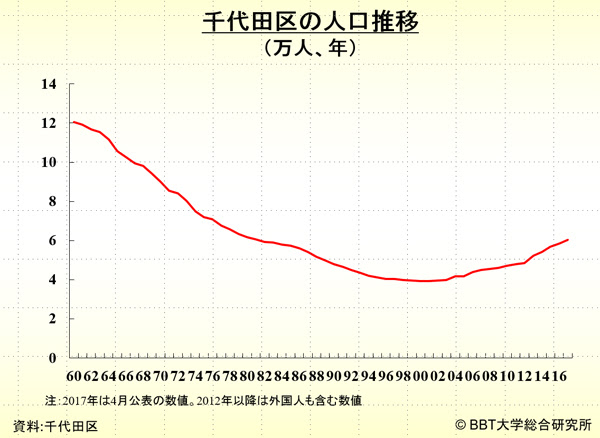 これら3つの都心三区というところは、学校の生徒がいなくなりました。千代田区の人口は12万人いたのが、4万人を割り込み、3万人台になってしまいました。今は6万人台に戻ってきていますが、こうした状況が起きているのです。学校が余ってしまい、統廃合が進んだわけです。私の子供たちも、通っている間に統廃合で非常に大変な騒ぎとなりました。