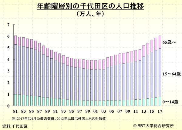 年齢階層別の人口推移を見ると、千代田区でも15歳から64歳の人が増えているのです。それにより0歳から14歳の人口が構造的に上がってくるので、学校が足りない事態となるわけです。