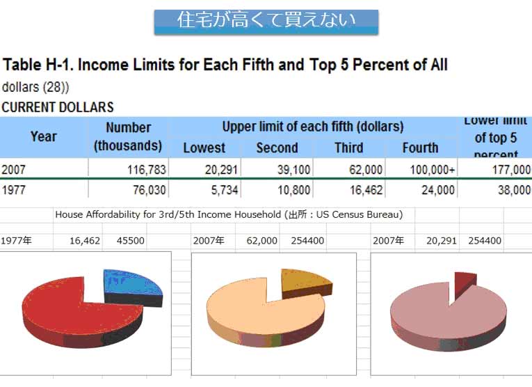 1977年と2007年の数値を挙げた。下部の円グラフは、所得に対する住宅価格の大きさで、左端に置いた1977年のものは、真ん中2割の所得層だけを取り上げている。青の所得でえんじ色の中心価格の住宅を買うことになる。当時でも持ち家比率は6割を超えているので、この層はすでに新規購入の層とは言えないかもしれない。