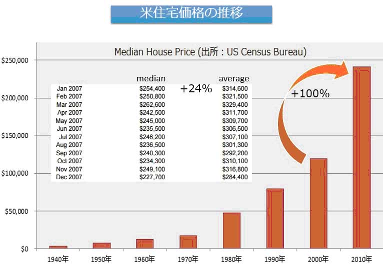 ここで、住宅価格がどうなっていたかも確認しておこう。米国勢調査局と米住宅都市開発省のデータを順に掲げる。前者のグラフ内部に添付の数値は、バブルの崩壊時2007年の月別中心価格と平均価格、後者のグラフ内部に添付のものは、住宅販売の前回のピーク1977年の月別中心価格と平均価格だ。