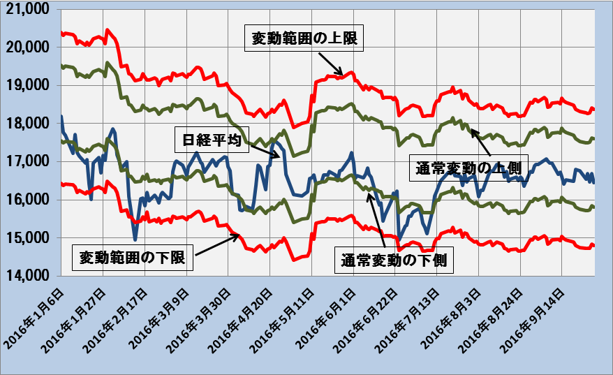 下図は日経平均と理論株価、そして通常の変動範囲の上側と下側に加え、上の3つのケースに対応する理論株価の位置を示したグラフです。