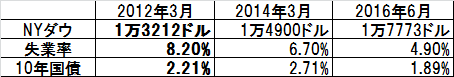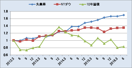 ※失業率とNYダウは基本的に逆相関の動きを示します。指標を見やすいものにする為、失業率を逆数にして再計算し、NYダウとの相関が見やすいように作図しました。10年国債の動きを含めて、これら3つの数値を2012年3月を1として、その後6か月ごとの変化を2016年6月まで連続して表示しております。