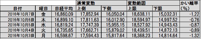 数表 :「直近5日間の日経平均と変動の範囲・かい離率」