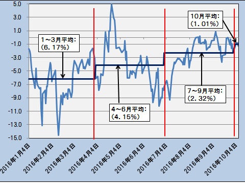 1~3月のかい離率の変動平均は6.17%、4~6月は4.15%、7~9月は2.32%、そして10月は7日までの平均が1.01%と、着実にゼロに向かって減少している、すなわち日経平均が理論株価に接近していることが分かります。