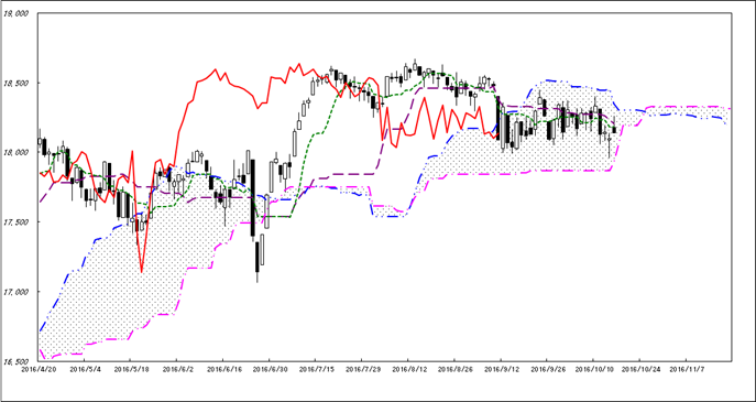 雲の中で右往左往しています。ここからは遅行線が日々線に絡むところであり、雲のねじれもあるので、週初に向かう方向に動くということになりそうです。週初に軟調となると雲を割り込んでの調整となるのでしょうし、堅調となると雲を抜けて上値を試すということになりそうです。