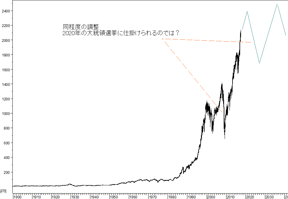 1900年からのチャートを見るとわかりますが、リーマンショック後の2009年以降の上昇局面は、一時的な上げ場面ではなく、以前からの上昇が全体で5波のパターンを作る過程での3波目の上げ局面である可能性があります。